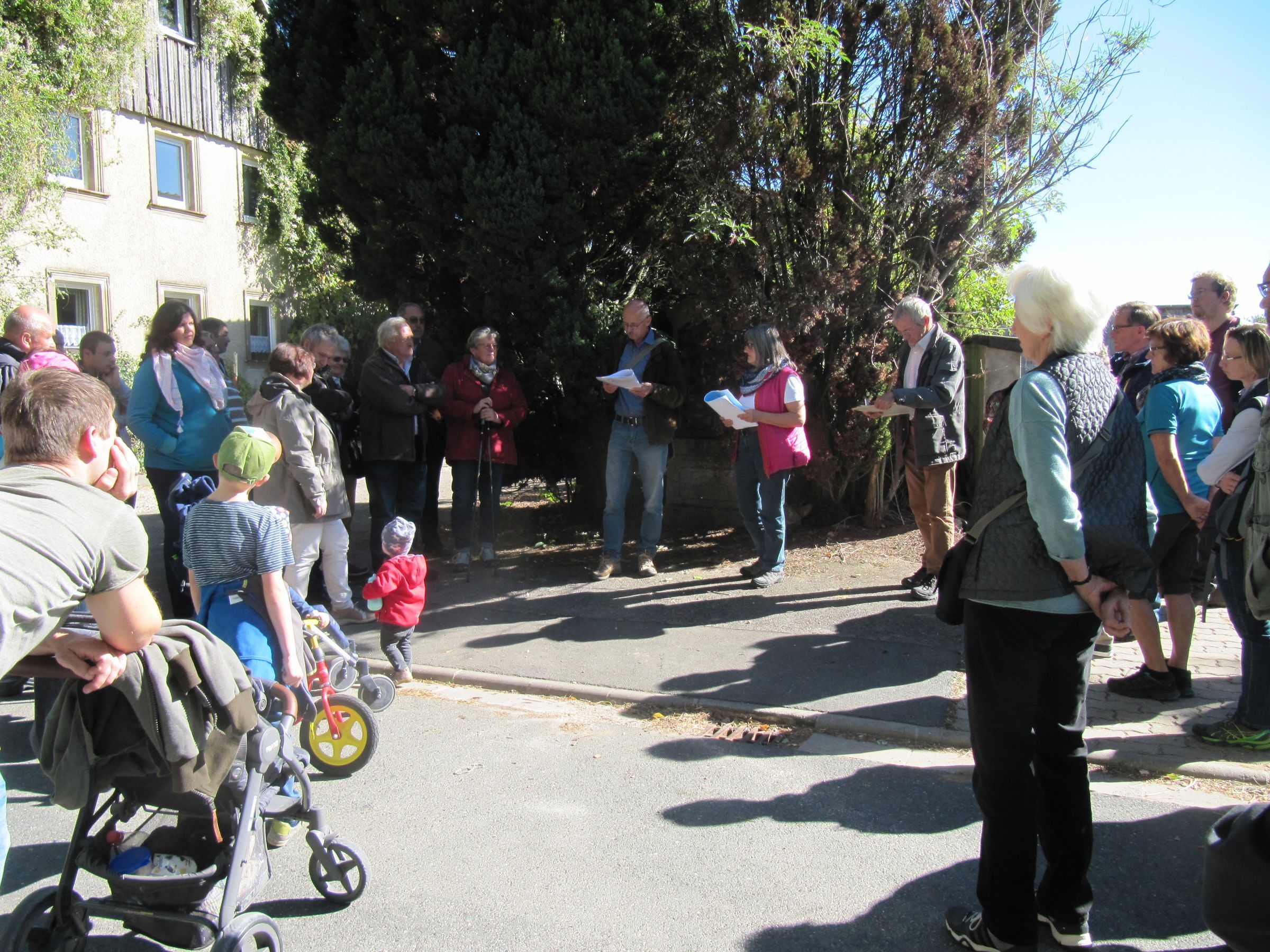 In der Dorfmitte beleuchtete Bernhard Christoph die Ortsgeschichte, die bis ins 12. Jahrhundert zurückreiche. Damals hieß der Ort „Kunemundesreut“. Ab dem Jahre 1230 gehörte die Ortschaft zum Besitztum des Klosters Langheim. Anhand von alten Wegenetzkarten wurde die typische Anlage des charakteristischen Straßendorfes aufgezeigt. So benutzte schon im Mittelalter der Abt des Klosters die Altstraße als kürzeste Verbindung zum Bischofssitz in Bamberg durch „sein Dorf Kümmersreuth“. Auf einem Stück dieser Altstraße, dem heutigen Kemitzenweg, begab sich die Exkursionsgruppe weiter bis man zu einer Blickachse zum Gesteinsabbaugelände am Deisenstein kam. Etliche Exkursionsteilnehmer reagierten betroffen; eine ältere Frau meinte: „Das sieht ja schlimm aus. Die Natur darf doch so nicht weiter ausgebeutet werden!“