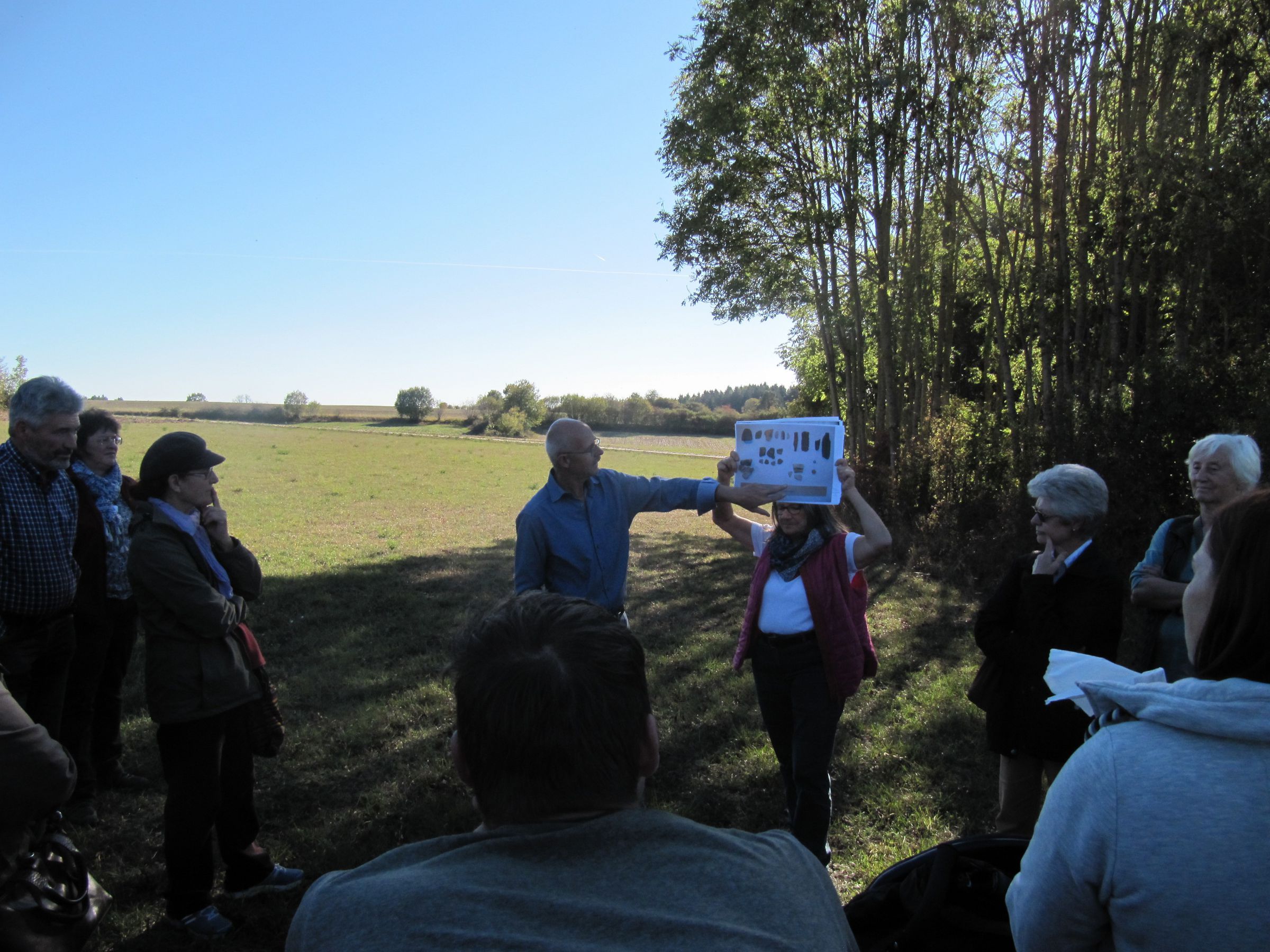 Schließlich gelangte die Exkursionsgruppe zu dem von den Steinwerken Neupert geplanten neuen Steinbruchareal zwischen dem 559 Meter hohen Rotschemel und Kümmersreuth. Etliche kleine Fundstücke wiesen darauf hin, dass das Gebiet ebenfalls schon von unseren Urahnen besiedelt gewesen sein müsse. Bernhard Christoph meinte: „Dies sollte uns zum Nachdenken bringen, wie wir mit unserer Vergangenheit umgehen. Die vielen Bodendenkmäler und die bereits geschehenen großen Eingriffe um Kümmersreuth mahnen uns zum achtsamen Umgang mit dieser Kulturlandschaft. Das Land außerhalb der Städte darf nicht zur bloßen Verfügungsmasse für Privat- und Staatsinteressen verkommen.“ Silvia Messerer, die 2.Vorsitzende der Bürgerinitiative gegen die Steinbruchpläne informierte die Anwesenden: „Bis dato sind noch keine detaillierten Pläne bei der Regierung von Oberfranken eingegangen, die auf die Einleitung eines Raumordnungsverfahrens hindeuten. Unsere Bürgerinitiative „KÜRBISS“ hat mittlerweile über 2000 Unterschriften von Steinbruchgegnern gesammelt. Wir werden weiterhin wachsam bleiben!“ Einige Exkursionsteilnehmer trugen sich auch spontan in die Unterschriftenlisten ein. BN-Kreisvorsitzender Anton Reinhardt mahnte: „Die Wohn- und Lebensqualität und die noch nicht zu Mondlandschaften gemachten Areale der Natur verdienen das volle Engagement für deren Schutz.“ Er bedankte sich für die lehrreiche Führung bei Bernhard Christoph mit einem kleinen Präsent.